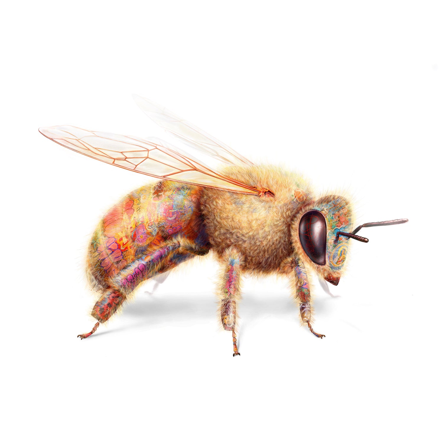 The bees are composites of multiple drawing styles layered as tattoos on complex, high-resolution pieces. Extensive oil, graphite, and digital prototypes were produced in order to develop the collection.